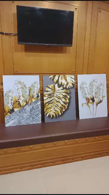 تابلوه الأوراق والزهور الذهبية – 3 قطع مستطيلة